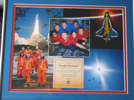 Dwight was a Virginia resident and life-long NASA advocate. He attended 18 shuttle launches, driving most of the night from Virginia. He was a model rocketeer and handmade an 8 foot shuttle for launch. He made painstaking hour-long animated movies of space flight! A humble person, working as a maintenance supervisor and art framer, Dwight dedicated his life to space and manned space flight! He had a 17 inch telescope in his backyard. He promoted the shuttle program to everyone he knew. You did not visit Dwight in northern Virginia without visiting the Space Museum or more recently the Udvar center. Dwight was truly the common man's representative for the manned space program. In May of 2005, we sent e-mails out to congresspersons in Virginia with the above description of Dwight. We received a reply from Daniel Scandling, Chief of Staff for Congressman Frank Wolf, indicating that he had reached out to NASA. In June, Mr Scandling e-mailed that we would be hearing from NASA. A few days later we got a call from Kathleen Ausley, of NASA. She said that NASA had put together a tribute to Dwight. We agreed that we would get together for a small lunch in Manassas, Virginia when the family traveled there on Dwight's birthday. On September 30th we